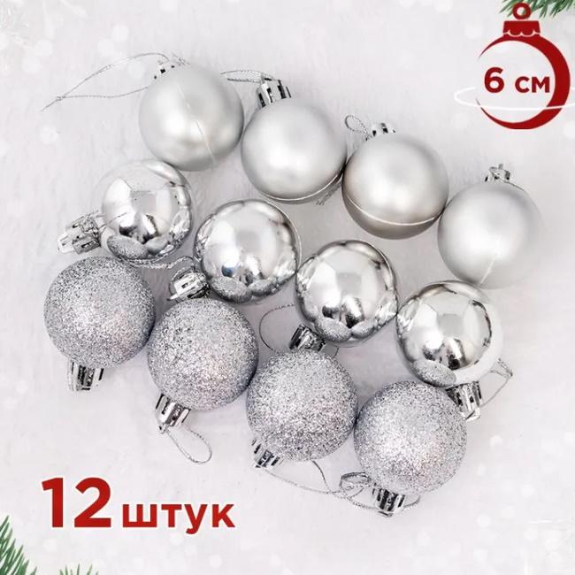 Украшение елочное подвесное Шар серебро матовый глянец глиттер 6см набор 12шт